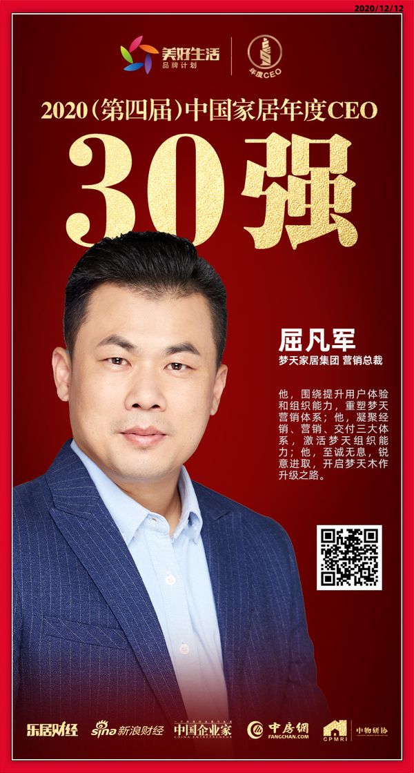 新浪家居讯 12月12日,在“2020(第四届)中国地产新时代盛典”现场,梦天家居集团营销总裁屈凡军荣获“2020中国十大家居年度CEO”。本次盛典在上海国家会展中心举行,来自地产物业家居三大行业约1000位精英参会。屈凡军获奖后走进“乐居红人节”直播间,接受乐居主播采访,并分享获奖感言。