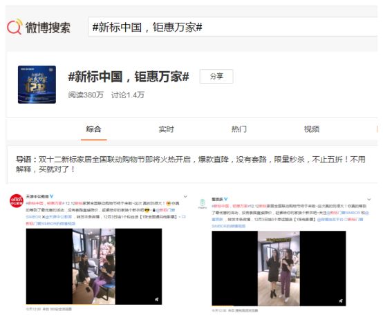@新标门窗SIMBOR 官方微博联手38家品牌,#新标中国,钜惠万家#话题量超380万,直逼热门话题!和抖音强强联合进行宣传造势,被转发讨论,粉丝活跃参与,互动频繁!