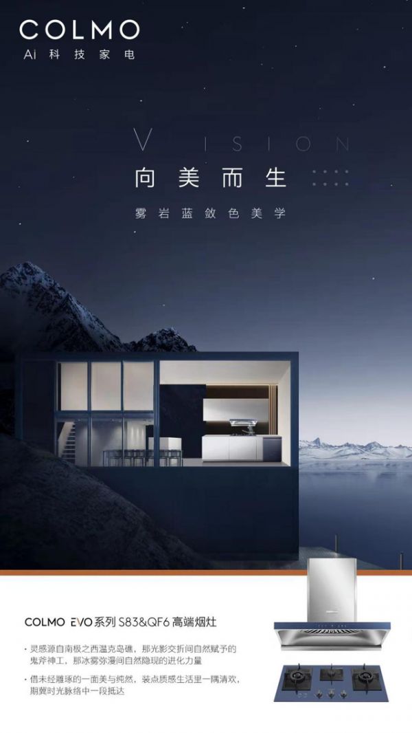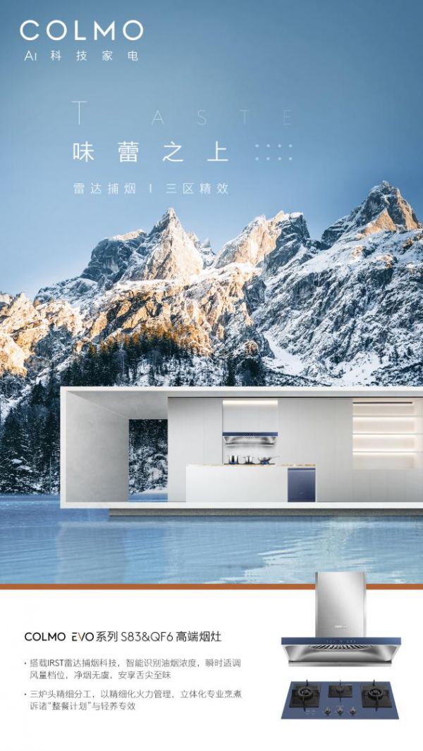 COLMO EVO系列S83&QF6高端烟灶套装无论是在功能上,还是在外观上,都符合不断崛起的中高产阶级多样化、品质化的消费需求,可以帮助消费者打造一间真正轻净、无扰、高效、便捷的理想厨房,让用户发现烹饪的乐趣,悦享生活美学。