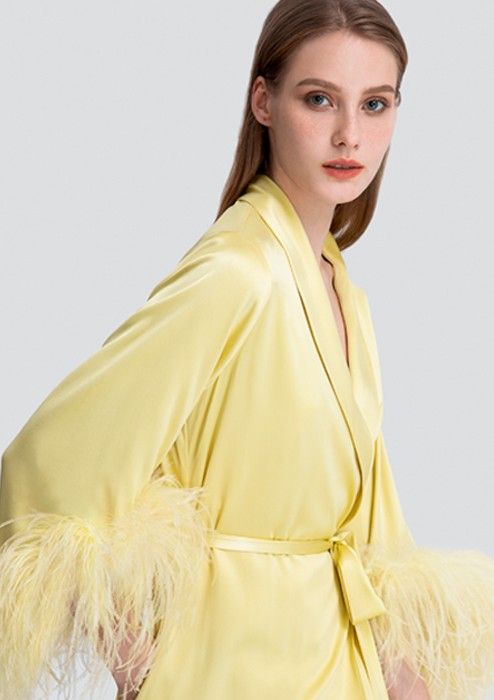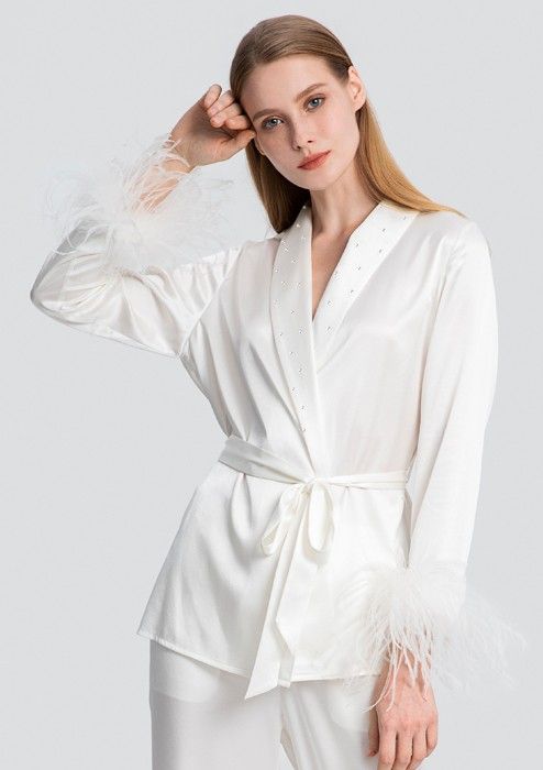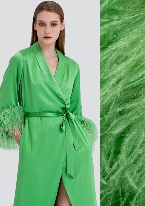 Diva系列鸵鸟毛睡袍套装,丝羽结合,打造复古摩登造型。袖口鸵鸟毛细节加持,让你致胜全场。水晶元素缀于青果领之上,即刻灵动闪耀。腰带收腰设计修饰身形,举手投足间散发迷人风情。