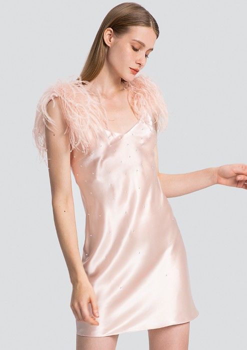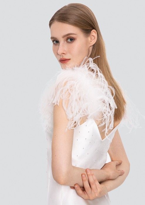 Diva系列鸵鸟毛吊带裙,肩带处饰以飘逸鸵鸟毛,绽放灵动优雅。闪亮悦目的水晶元素璀璨迷人。高品质弹力桑蚕丝质感垂坠,尽显女性性感魅力。