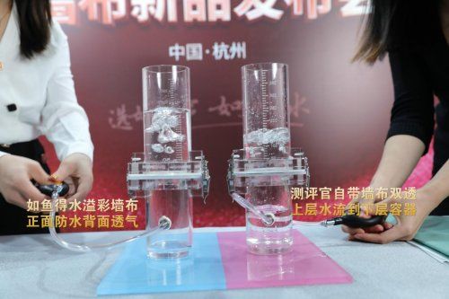 在日常家居生活中,墙布不仅要便于清洁,更要耐得住高温,不同气候环境下,周围的温度、湿度都对墙布提出更高的要求,现场测评官用100°高温热水,将如鱼得水墙布的放到杯子浸泡,并进行搅拌,最终水还是非常清澈,说明其色牢度非常高,产品性能非常稳定。而且取出后对比也没有异味,足以说明工艺也非常环保。