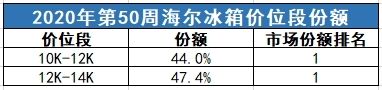 具体来看,在10K-12K、12K-14K价位段,海尔冰箱分别以44.0%、47.4%占比领先,在取得第一份额之外持续扩大万元价位段优势。