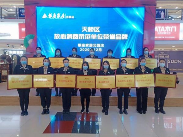12月11日上午,天桥区市场监督管理局举办“放心消费在山东”授牌仪式,银座家居北园店经营品牌A.O.史密斯、美标卫浴、艾娅全屋定制、德雅高尼全屋定制、马可波罗瓷砖、圣象地板、松堡王国儿童家具、雅兰床垫、赖氏家具、左右沙发、红日家具、弗沃德家具、大自然地板、慕斯寝具以及欧派橱柜共15个一线品牌应邀参会,荣获“放心消费示范单位”荣誉称号(排名不分先后顺序)。