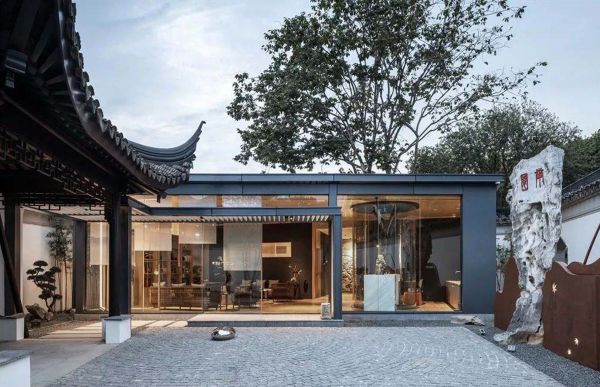 改造时,整体的建筑风格没有进行大刀阔斧的改造。顾鑫及团队尊重了原本园林设计的初衷,保留建筑原有的符合苏州园林粉墙黛瓦的特点,在入院处用钢结构和玻璃墙新建了一个现代感较强的接待区,这样不破坏原建筑的古韵,也符合现代审美,而历史与当下的对立,在古园的时间轴上形成了极强的节点。