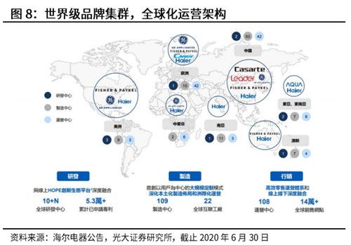 具体来看,在品牌制造上,海尔智家布局早,能力强,建立了全球研发体系。一方面,海尔智家在战略上很早就提出了品牌化的概念,另一方面,技术和品牌储备不仅仅在国内,前期收购的资产使得公司率先建立全球范围内的布局。2019年,卡萨帝收入已突破70亿元,正是海尔智家品牌制造能力的集中体现。