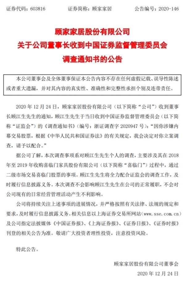 顾家家居(603816)12月24日晚公告,当日,公司收到董事长顾江生的通知,顾江生于当日收到证监会的《调查通知书》,因其涉嫌内幕交易股票,证监会决定对其立案调查。据公司了解,本次调查事项系对顾江生个人的调查,主要涉及其在2018年至2019年收购喜临门过程中,通过二级市场交易喜临门股票的事项。
