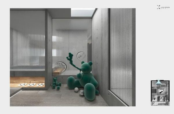 首先是门厅,在门厅处,郑伟放置了一大一小两个可爱的玩偶,通过两个玩偶趣味性的对话来欢迎远方到来的朋友。背景朦胧的玻璃屏风既有空间阻隔又不影响光线。而下面坐着的大玩偶,无论何时都张开柔软的怀抱为游玩回来的客人排减疲劳,小玩偶每天都能静静的听客人分享游玩的趣事,就算到了离别时也可以带它回家,让它成为这次旅行的见证和美好回忆。