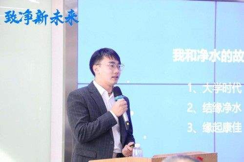 接着,康净产品经理卢印,为大家介绍了康净的物联智能净水机。物联智能净水机搭载RDU-AIOT物联网净水技术,其先进的美国航天级RO膜能深度过滤水中重金属离子;同时通过双重紫外线能二次杀灭水中的顽固细菌,保障用水安全。物联智能净水机可有效融合物联网设备管理平台、运营平台、财务平台、CRM系统、售后服务系统等多个系统平台,实现商用净水的全方位运营的同时,用户可以通过公众号或APP关联直饮机,随时随地观测到直饮机的运行状态,实现实时在线管理设备、在线水质查询、在线水机保修等多个便捷功能与个性化服务。