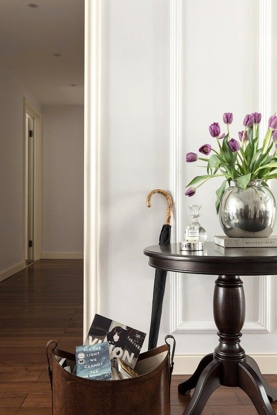 在玄关与客厅的连接处,一束花、一抹香,迎接着回家的好心情,随手带回来的物具也需要有所安置,落地的皮质收纳篮便恰好发挥起了作用。
