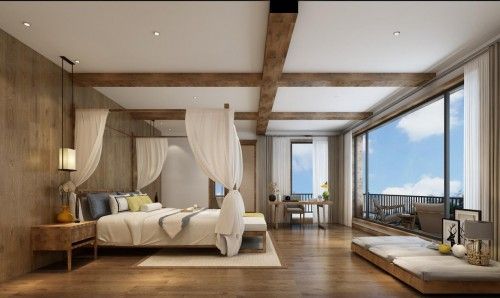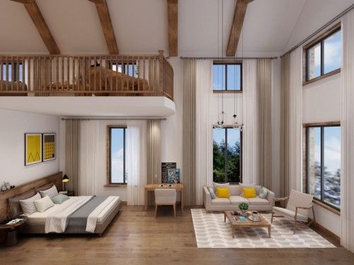 主卧同样以原木、白色为主,配色简约而均衡,符合东方审美中的留白一说,赋予空间更多想象力。凌空悬挑的复式设计,更好地利用了别墅的层高优势,也使得空间更开阔。