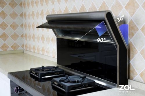 而集成灶相比于油烟机,有着“低空近吸”的物理优势,油烟刚刚生成还没来得及扩散就被瞬间吸走,一般不会出现跑烟的现象。比如这款金帝P900KX蒸烤消一体集成灶采用了鸥翼门设计造型,翻板直角打开为90°,同时头部前倾角为30°,创新性的实现了120°全景净吸技术,更大的进风角意味着更高的油烟吸净率,恼人的油烟出锅后即可被快速吸走。