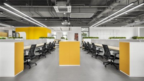 职员空间 :职员开放工位,方便沟通交流,屏风在一定程度上减轻声音带来的干扰,为员工提供专注思考的空间。