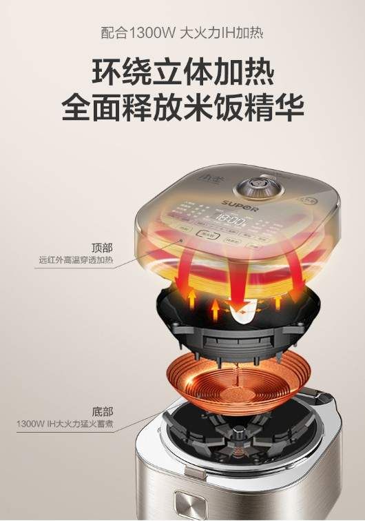 第二大亮点是苏泊尔电饭煲采用了IH加热技术。目前国内中高端电饭煲均采用了IH加热技术,相比传统电饭煲先加热底盘,然后将热量从下向上传递的加热方式,IH技术通过电磁感应,使得内胆自身发热,加热速度更快,火力更大而且可以精准控温,很好的避免了用电饭煲做米饭夹生的问题。而且与在顶盖位置的远红外穿透加热技术一起工作,可以实现360°覆盖式的包裹加热,使米饭受热更加均匀。