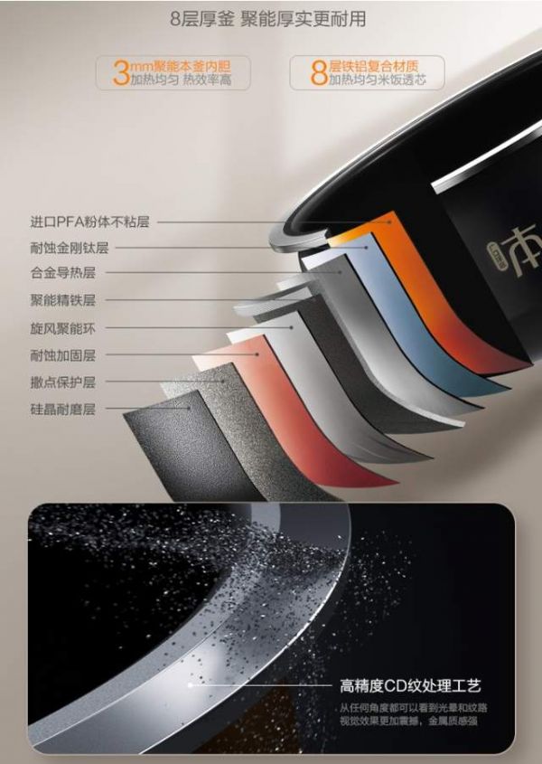 苏泊尔本釜内胆涂层还采用了PFA粉体涂料不粘层,该技术在日韩市场的普及度已高达90%,大大提高了电饭煲内胆的不粘寿命。除此之外,8层厚釜的复合材质,也保证了内胆的耐磨耐用性。