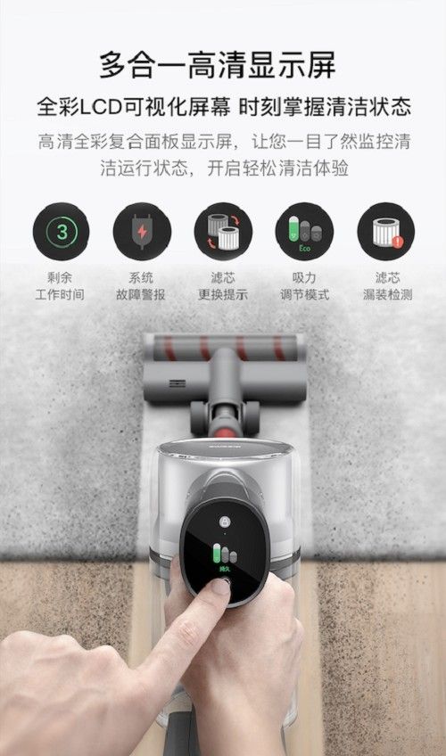 除了与T10拥有同样的多锥分离技术、H12级高效滤芯以及可拆卸电池和尘杯之外,这款预售价1899元的T20,将马达转速提升到了12.5万转/分钟,具备150AW超大吸力,清洁效果得到进一步完善和提升,并且拥有长达70分钟的续航能力。而与T10不同的是,T20拥有智能全彩屏幕,配备了16bit深度全彩显示、QVGAM高清屏幕以及4H强化复合面板,消费者可清晰全面地掌握机器的全部信息,更加智能和人性化。