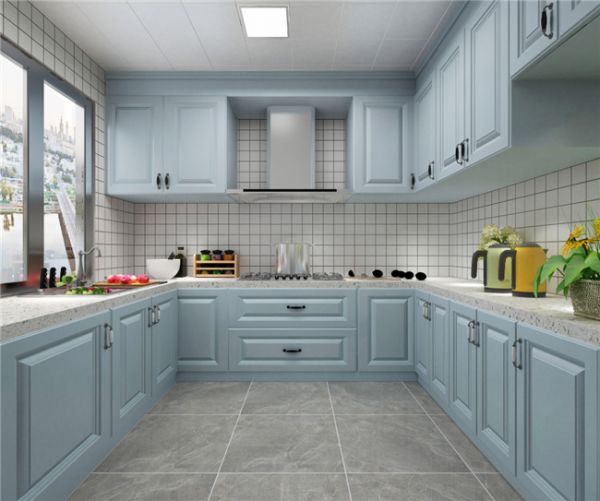厨房的所有柜面均粉刷成了这两年流行的莫兰迪色——蓝色,与格子白的马赛克墙面毫无违和感,反而在小资的格调中增添了高级感,塑造出温馨、舒适的北欧厨房。