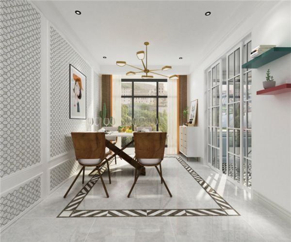 在餐厅设计上,设计师用线条感强的马赛克铺设了整面墙,搭配抽象的艺术挂画,让以浅色调为主的餐厅充满艺术气息。尺寸低矮的收纳柜,简洁、功能化且贴近自然,外观上展现出北欧风格独有的淡雅、朴实、纯粹的韵味与美感。