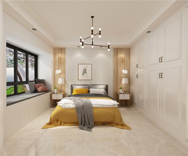 卧室是供人休息、放松身心的私人空间,设计师通过暖色系的色彩搭配营造出一个温馨、舒适的北欧卧室。米灰略带米黄色的瓷砖铺设的地面与米白色的入墙式衣柜相得映彰,橙色为主的床品既点亮了空间,也增添了空间的层次感。