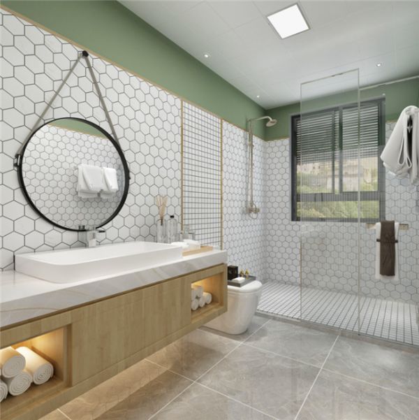 卫浴间的墙面全部铺设了线条感强的白色马赛克,既满足卫浴间搭配追求简洁的需求,也打破纯色墙面带来的单调感,增添了一丝艺术气息。原木的浴柜设计,以及墙面顶部的莫兰迪色——绿色,增添了空间的生活气息与层次感。
