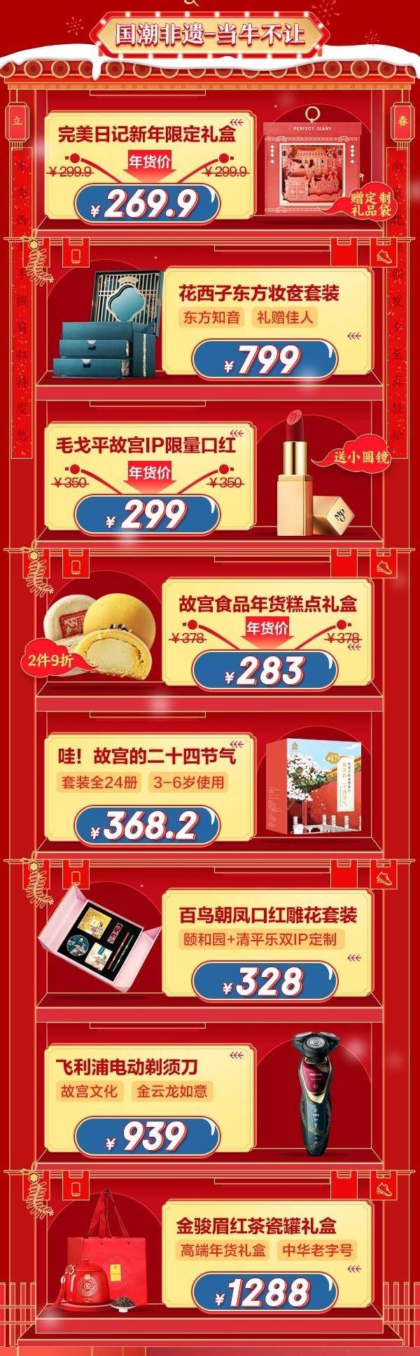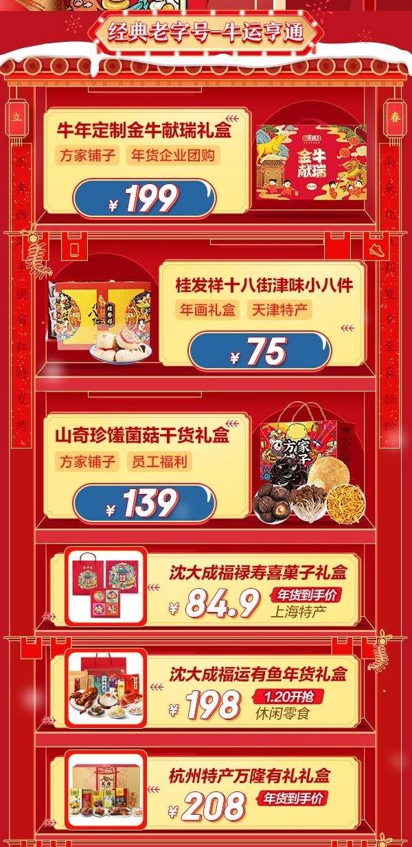 与过年相伴的,还有承载人们熟悉老味道的老字号产品。经过岁月的沉淀,很多老字号也秉承传统文化,在新年焕发出新意。北冰洋火箭联名款汽水、北京稻香村年货礼盒、大白兔奶糖混合口味礼盒、稻香村年货坚果礼盒、东来顺牛肉大克重礼盒等等共同祝愿牛年行大运。中国人讲究新年转运,人们对新年好运的追求代代传承,牛年定制金牛献瑞礼盒寓意美好,王老吉凉茶年货礼盒,桂发祥十八街津味小八件,山奇珍馐菌菇干货礼盒等等,让你看遍各地家乡特色,回忆家乡年味。