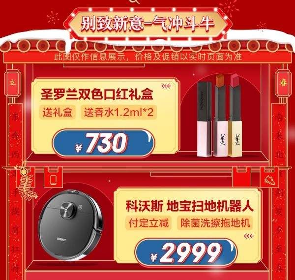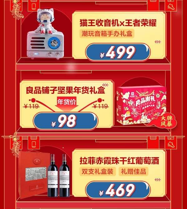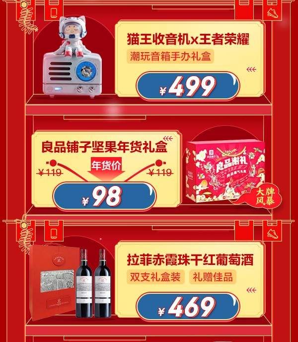 下单科沃斯地宝扫地机器人,给家人一个惊喜,将卧室轻轻松松打扫干净;将猫王收音机X王者荣耀联名潮玩音箱手办礼盒送给喜欢音乐又爱打游戏的男票,听歌打游戏都不耽误;拉菲赤霞珠干红葡萄酒可以说是送给老爸的佳品。当然啦,新年一定要实现“车厘子自由”,智利进口车厘子 JJJ级礼盒装,为家人的欢聚时光增添美味享受,让大家在过年期间享受礼物内在蕴含着丰盛、美好的意义。