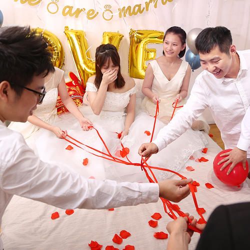 1、一线牵,这是一个既简单又好玩的游戏,首先从新娘的房间里牵出一些红绳,新娘手中拿一根,让新郎从中抽出一根,猜错了就有惩罚,不过在小编看来能够凭借运气选对真的挺不容易。