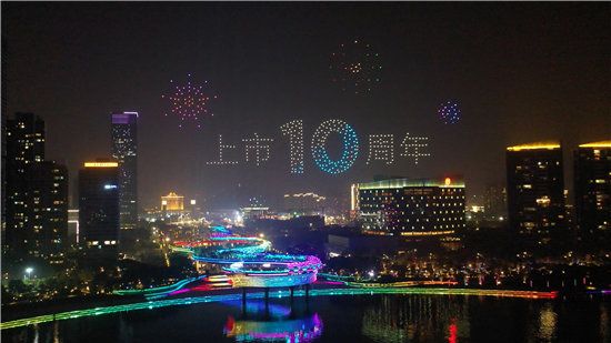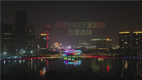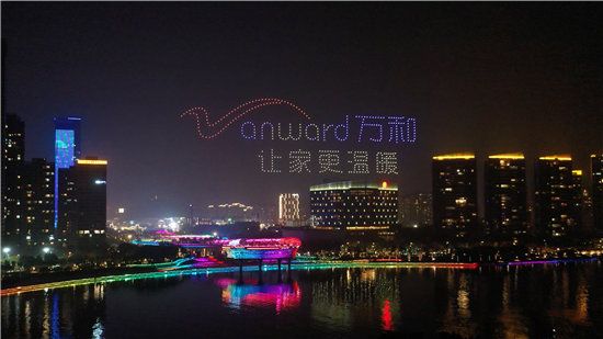 2021年1月27日晚,美丽的德胜河畔,流光溢彩的“金凤凰”广场,500架无人机腾空而起,相继变幻出“万和电气 002543”、“上市十周年”、“花洒一开、热水即来”、“全球5000万家庭的温暖选择”、“万和LOGO”、“我爱万和”、“我爱顺德”等文字和图案,为万和电气(股票代码:002543)上市十周年送上一份贴心的礼物,也点亮了当晚顺德的夜空。