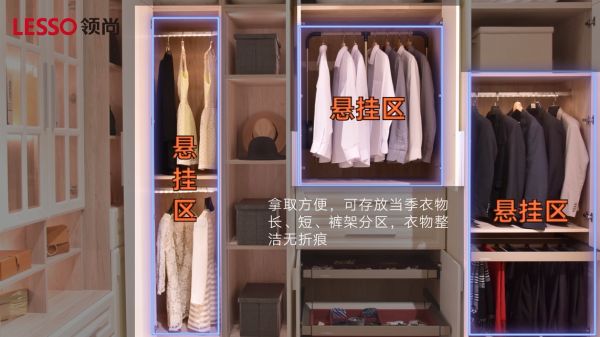 领尚衣柜根据衣物的长短、使用的频率以及人体工程学分为不同的区域进行精细化设计,有长衣悬挂区,短衣悬挂区、裤挂区、叠放区,达到分类整理的效果。