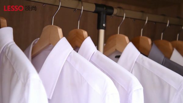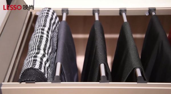 领尚衣柜根据衣服的长度分出长衣悬挂区和短衣悬挂区,裤子还可以用裤架挂起来,使衣物保持最佳外形状态,不产生折痕。这个区域主要用来收纳那些容易产生折痕,需要保持形制的衣服,比如衬衣、西装、大衣、部分裤装等。