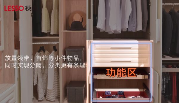 领尚衣柜在分区设计上融入了专业的衣柜收纳整理法则,善于处理好人和物品空间的关系,为建立“秩序感”做足准备。