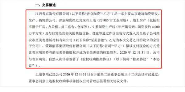 2020年12月31日,蒙娜丽莎与普京陶瓷、自然人冼伟泰签署了《股权收购框架协议》。公告显示,自标的股权完成交割后,为保证至美善德后续正常生产经营,甲方有权以现金方式对至美善德进行增资,乙方及丙方同意就甲方上述增资事宜在至美善德的董事会和股东会投赞成票,并同意放弃增资权利。