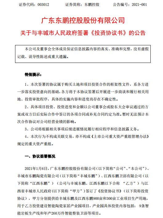 1月6日晚间,东鹏控股(003012.SZ)发布公告,公司拟投资50.8亿元,投资建设江西丰城智能陶瓷家居产业园项目。公告显示,东鹏控股联合下属公司丰城市东鹏陶瓷有限公司(丰城东鹏)、江西东鹏卫浴有限公司(江西东鹏),与江西省丰城市政府签订了《投资协议书》。