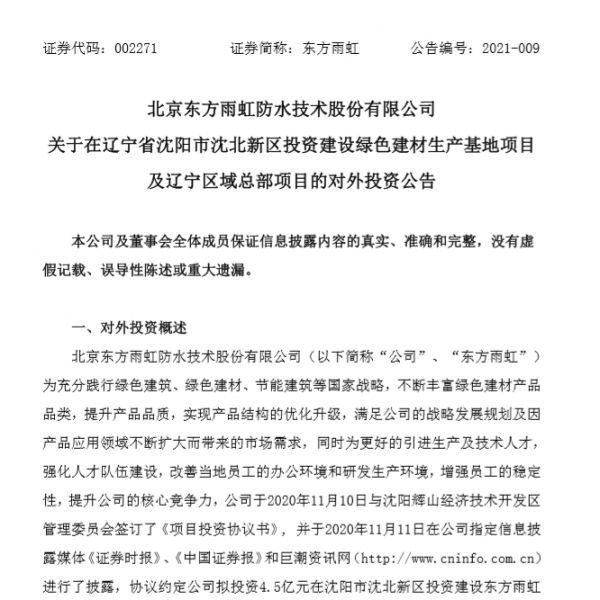公告中表示,东方雨虹已与沈阳辉山经济技术开发区管理委员会签订《项目投资协议书》,协议约定公司拟投资4.5亿元在沈阳市沈北新区投资建设东方雨虹绿色建材生产基地项目及辽宁区域总部项目;
