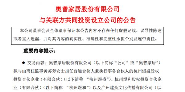 公告中显示:奥普家居股份有限公司(以下简称“公司”或“奥普家居”)拟与由离任监事黄苏芳女士担任普通合伙人兼执行事务合伙人的杭州煜盛股权投资合伙企业(有限合伙)(以下简称“杭州煜盛”)、杭州煜和股权投资合伙企业(有限合伙)(以下简称“杭州煜和”)以及广州建众文化传播有限公司(以下简称“广州建众”)共同投资设立浙江奥普阳台科技有限公司(暂定名,以公司登记机关最终核准的企业名称为准)。
