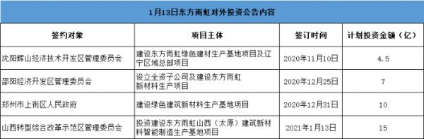 1月13日,东方雨虹(002271.SZ)连发4条对外投资公告,本轮对外投资总额达36.5亿元。