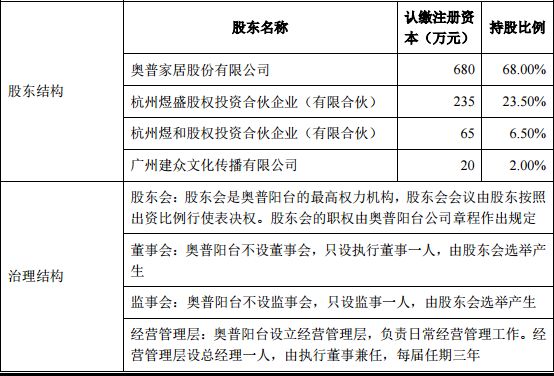 奥普阳台注册资本1000万元,其中公司拟以自有资金出资680万元持有68%股权,杭州煜盛出资235万元持有23.5%股权,杭州煜和出资65万元持有6.5%股权,广州建众出资20万元持有2%股权。