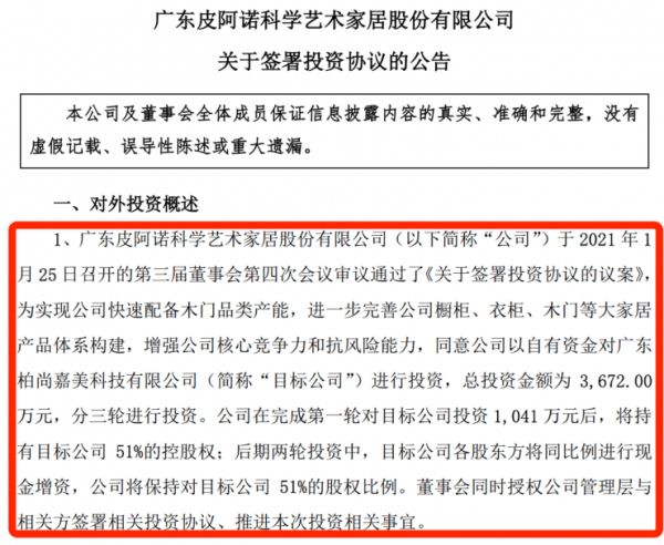1月25日,皮阿诺(002853.SZ)召开第三届董事会第四次会议审议通过了《关于签署投资协议的议案》,公司以自有资金对广东柏尚嘉美科技有限公司(简称“目标公司”)进行投资,总投资金额为3672万元,分三轮进行投资。