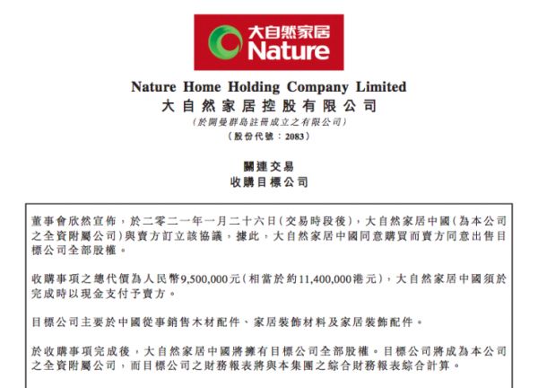 1月26日,大自然家居(02083.HK)发布公告,大自然家居中国(为公司全资附属公司)与卖方自然优品科技(横琴)有限公司订立该协议,据此,大自然家居中国同意购买目标公司广东优众家居有限公司全部股权,总价为人民币950万元,大自然家居中国须于完成时以现金支付予卖方。