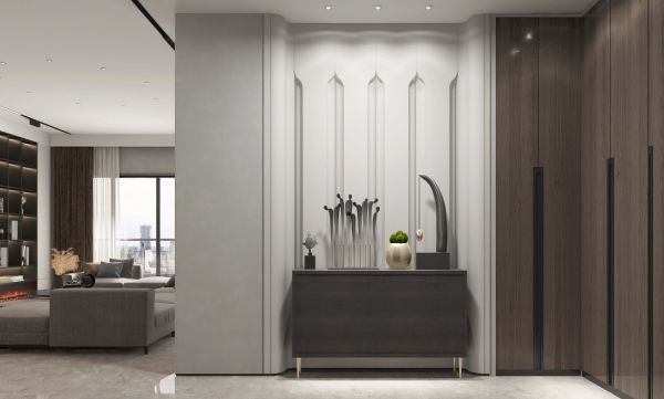 在客厅的空间中,浓郁的中式风似乎席卷着一缕茶香扑面而来,案台清明。走入其间不觉想要抛去门外那些喧嚣的烦恼,手捧籍册,奉上盏清茶,找寻这片高楼大厦间的属于自己的方寸“南山”。空间里绵延出的灰白色与带有木质纹理的棕褐色相交相融,将空间的生命力与自然气息相接相通。每一隅都在向居住于此的人诉说着远离尘嚣的闲适心情与超然外物的淡然心态。