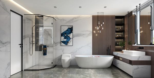 浴室空间的墙面白色基底绘上灰色的纹路,空间延伸感与张扬个性的表达增强。透明的淋浴室在视觉上最大程度地增加了空间的面积。墙上那副耀眼的蓝色装饰画是这片空间中惊艳的一笔,是居住者审美视域下个性的展现。灰白的色调让空间给人以洁净的气息,木质的棕色纹理又为其带来自然的暖意,给居住者以早春冬雪融化却不觉寒冷的春境之感,像是踏春的诗人,步履悠闲,典雅别致。