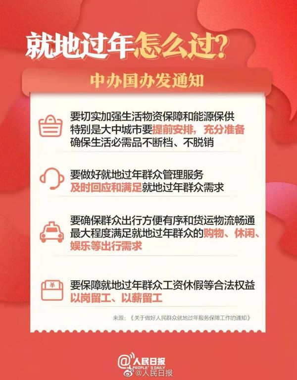 面对中国首次的“就地过年”,近日,中共中央办公厅、国务院办公厅印发了《关于做好人民群众就地过年服务保障工作的通知》,内容涵盖疫情防控、市场供应、交通出行、快递物流等各个方面,并高度明确地方各级政府和用人单位要积极做好就地过年员工特别是外地农民工假期餐饮、住宿、医疗等服务保障。与此同时,通知还表示要增加网络、电视、广播等文化体育节目供应,鼓励提供免费流量、网络视频APP限时免费电影放映等线上服务,低风险地区图书馆、博物馆、影剧院、公园、体育场等公共活动空间,在严格落实疫情防控要求前提下,保障开放时间,为群众提供丰富多样的文化体育活动。按照限量、预约、错峰等要求,保障旅游产品供给,丰富假日旅游活动,更好满足群众旅游休闲需求。鼓励各地结合群众春节需求,积极提供非接触、少聚集的各类消费项目和社会服务。