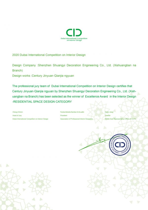 由中华文化促进会中东代表机构(Chinese Cultural Promotion Society Middle East Representative Office)和中东(迪拜)专业室内设计师协会(APID)联合主办。迪拜国际室内设计大赛遵照符合主题的标准,着重通过点、线、面、体的逻辑,从商业空间、餐饮空间、酒店空间、办公空间、公共空间、展览空间、会所空间、住宅空间、样板房空间、软装设计、概念设计11大参赛类之中找寻世界各地最优秀的室内设计师,共同竞技角逐大奖。经由19位国际评审专家为期数月的评审,2020年第二届迪拜国际室内设计大赛共评选出金奖4名、银奖6名、铜奖13名、优秀奖14名。