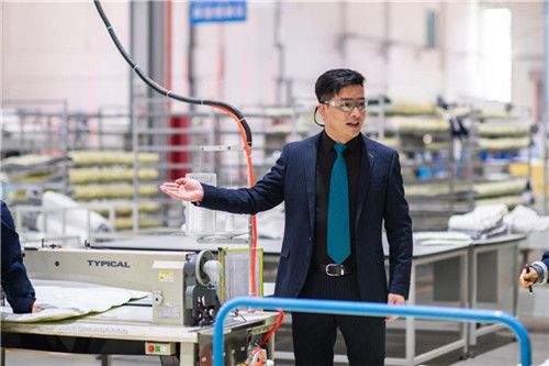 (图: 丝涟中国天津工厂厂长王小勇先生向媒体讲解丝涟高品质床垫各个部分的制造细节)