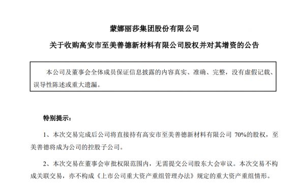 2月7日晚间,蒙娜丽莎集团发布《关于收购高安市至美善德新材料有限公司股权并对其增资的公告》。