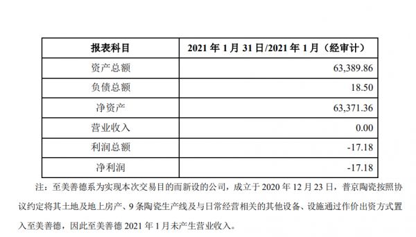 ▲注:至美善德系为实现本次交易目的而新设的公司,成立于 2020 年 12 月 23 日,普京陶瓷按照协议约定将其土地及地上房产、9 条陶瓷生产线及与日常经营相关的其他设备、设施通过作价出资方式置入至美善德,因此至美善德 2021 年 1 月未产生营业收入。