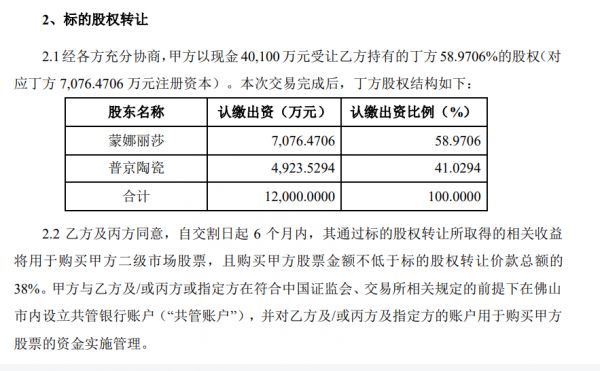 公告称,经双方友好协商,蒙娜丽莎集团于2021年2月7日与普京陶瓷、自然人冼伟泰及标的公司至美善德签署了《关于高安市至美善德新材料有限公司之股权收购协议》(以下简称“收购协议”、“本协议”),蒙娜丽莎将以现金40,100万元受让普京陶瓷持有的至美善德58.9706%的股权,并以现金25,000万元认缴至美善德新增注册资本4,411.7647万元,上述交易方案完成后,蒙娜丽莎集团将持有至美善德70%的股权。(以下 简称“本次交易”)。至美善德将成为蒙娜丽莎集团的控股子公司。