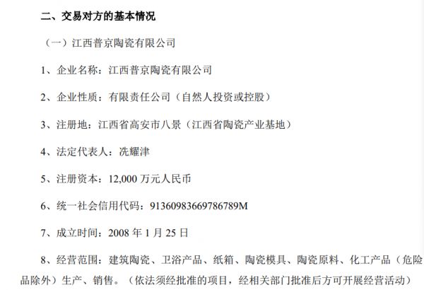 公告显示,本次协议签署方为——甲方:蒙娜丽莎集团股份有限公司,乙方:江西普京陶瓷有限公司,丙方:冼伟泰,丁方:高安市至美善德新材料有限公司。