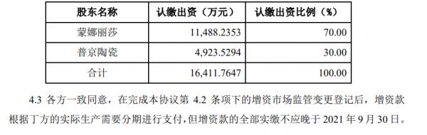 在增资方面,各方一致同意,自标的股权完成交割后,为保证高安市至美善德新材料有限公司后续正常生产经营,蒙娜丽莎集团以现金25,000万元(“增资款”)认购至美善德新增注册资本 4,411.7647万元。增资款中,4,411.7647 万元作为至美善德新增注册资本,20,588.2353万元作为溢价进入至美善德的资本公积金。