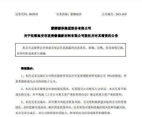 2021年2月8日,蒙娜丽莎(股票代码:002918)发布《关于收购高安市至美善德新材料有限公司股权并对其增资的公告》。交易完成后,公司将直接持有高安市至美善德新型材料公司70%的股权,至美善德将成为公司的控股子公司。